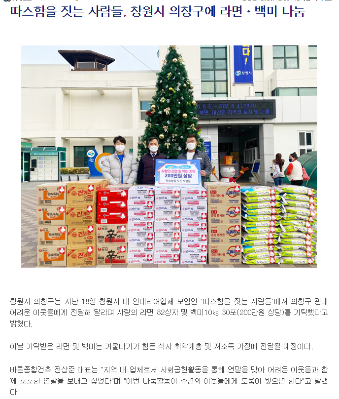 창원시 의창구는 지난 18일 창원시 내 인테리어업체 모임인 `따스함을 짓는 사람들`에서 의창구 관내 어려운 이웃들에게 전달해 달라며 사랑의 라면 82상자 및 백미10㎏ 30포(200만원 상당)를 기탁했다고 밝혔다.